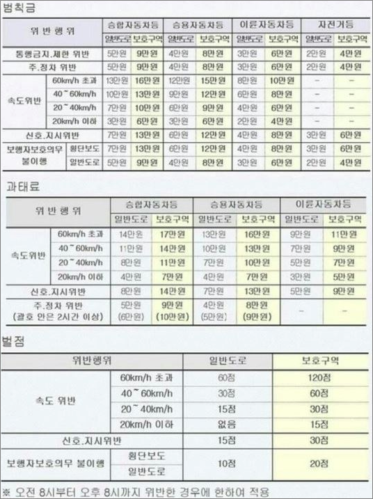 구 분 승용차 승합차 과태료 7만원(보호구역 13만원) 8만원(보호구역 14만원) 범칙금 6만원+벌점 15점(보호구역 2배) 7만원+벌점 15점(보호구역 2배)