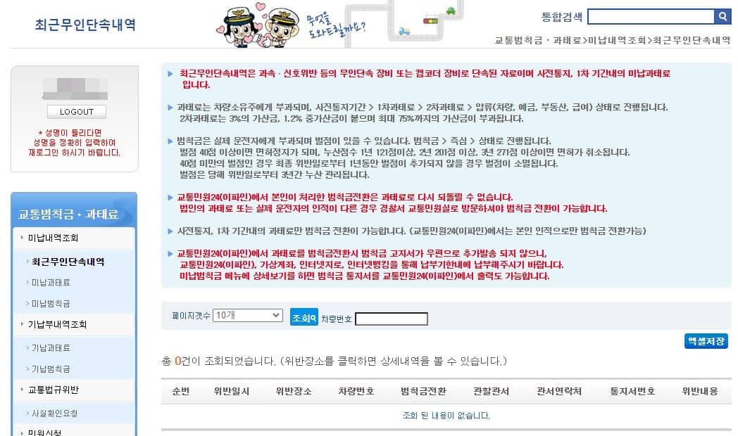 이제 본인인증이 끝내면, 아래쪽과 나란히 교통범칙금 과태료 미납 내역을 보실 수 있고요. 제 개인 인증서로 로그인한 결과 미납 과태료가 없는 것을 보실 수 있고요.
