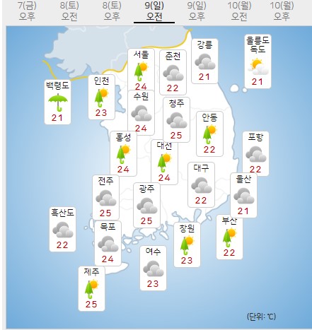 9일 일요일은 중부지방(강원영동 제외)과 전라권, 경북권,경남 서부내륙에 소나기가 오는 곳이 있겠죠.