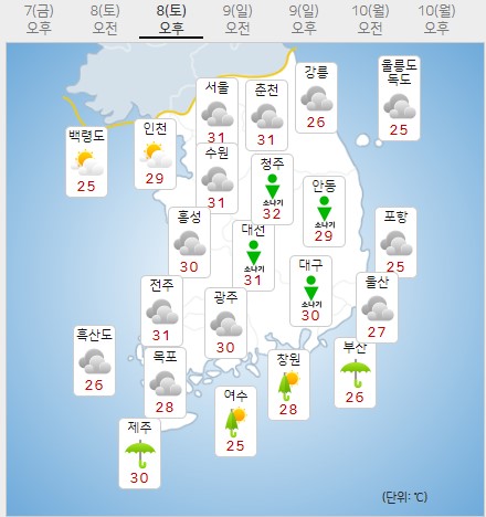 기상청에 기초하면 토요일인 8일 남부지방에 강한 비가 내리겠죠. 수도권과 강원도를 중심점으로 낮 기온이 31도 끝으로 오르겠죠. 높은 습도까지 더해져 체감온도가 33도에 달해 무덥겠죠. 일요일인 9일 오후 3시부터 오후 6시까지 중부지방 각지에 소나기가 내리겠죠.